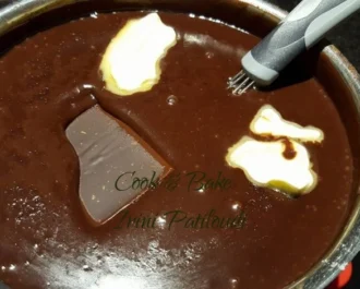 Όταν δέσει καλά η κρέμα βάζουμε την κουβερτούρα και το βούτυρο και ανακατεύουμε.