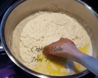 Μόλις λιώσει το βούτυρο ρίχνουμε το αλεύρι και ανακατεύουμε καλά μέχρι να γίνει ζύμη σφιχτή και να ξεκολλάει από τα τοιχώματα τις κατσαρόλας. την αφήνουμε να κρυώσει σε άλλο σκεύος.