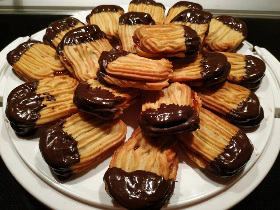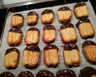 • Αφού κρυώσουν βάζουμε σε ένα μπισκότο μαρμελάδα αρεσκείας μας και το καπακώνουμε με άλλο μπισκότο. Βουτάμε σε 300γρ λιωμένη κουβερτούρα με 2 κουταλιές ηλιέλαιο την μία άκρη τους και τοποθετούμε σε λαδόκολλα μέχρι να στεγνώσουν. Καλή απόλαυση!