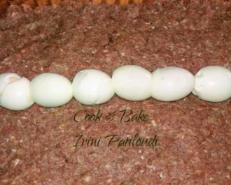 Πατάμε να ανοίξει από πάνω τον κιμά που έχουμε ζυμώσει πολύ καλά. Τοποθετούμε τα βρασμένα αυγά 6 λεπτά στην σειρά.