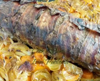 ο τυλίγουμε σε ρολό σφιχτό και το τοποθετούμε σε ταψί ή γάστρα. Μπορείτε να βάλετε δίπλα, πατάτες, καρότα, κρεμμύδια, λαχανικά με λίγο νεράκι, λάδι και μπαχαρικά.