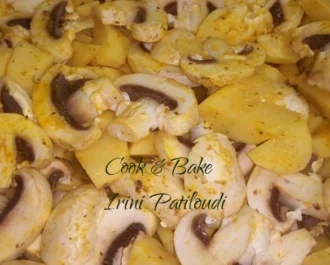 • Ετοιμάζουμε τις πατάτες και τα μανιτάρια σε άλλο ταψί, μπορούμε να ψήσουμε και το ρολό μαζί αν θέλουμε, εδώ τα βάλαμε χώρια. Βάζουμε τα μπαχαρικά μας , κύβο, μουστάρδα,1 ποτήρι νερό, λάδι και ψήνουμε για 1 ώρα στους 200 βαθμούς να πάρουν ωραίο χρώμα.
