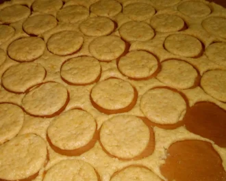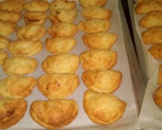 Κάνουμε την ζύμη μας να είναι μαλακιά και να μην κολλάει. Ανοίγουμε σε φύλλο χοντρό. Με ποτήρι κόβουμε στρόγγυλα κομμάτια γεμίζουμε και κλείνουμε σε μισοφέγγαρο και πατάμε με πιρούνι τις άκρες για να κλείσουν καλά.