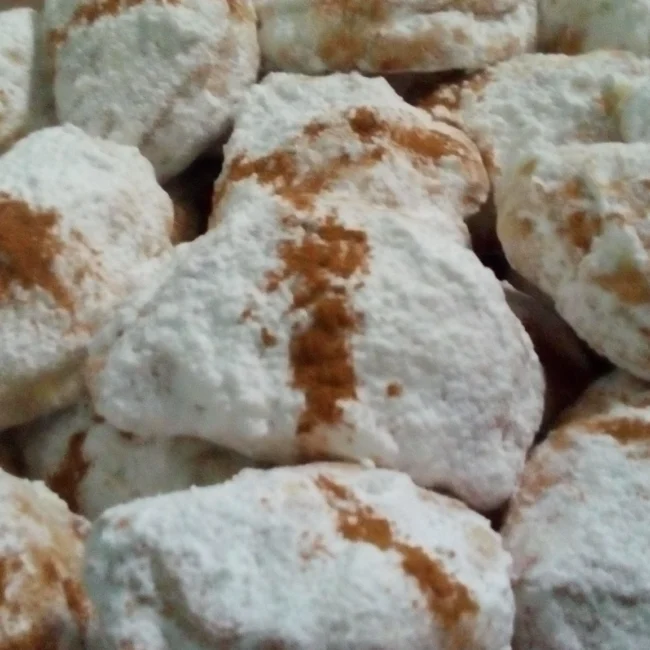 • Ψήνουμε σε 180 βαθμούς αέρα για 25 λεπτά. Αφού κρυώσουν τα περνάμε από ζάχαρη άχνη και πασπαλίζουμε με κανέλα.
