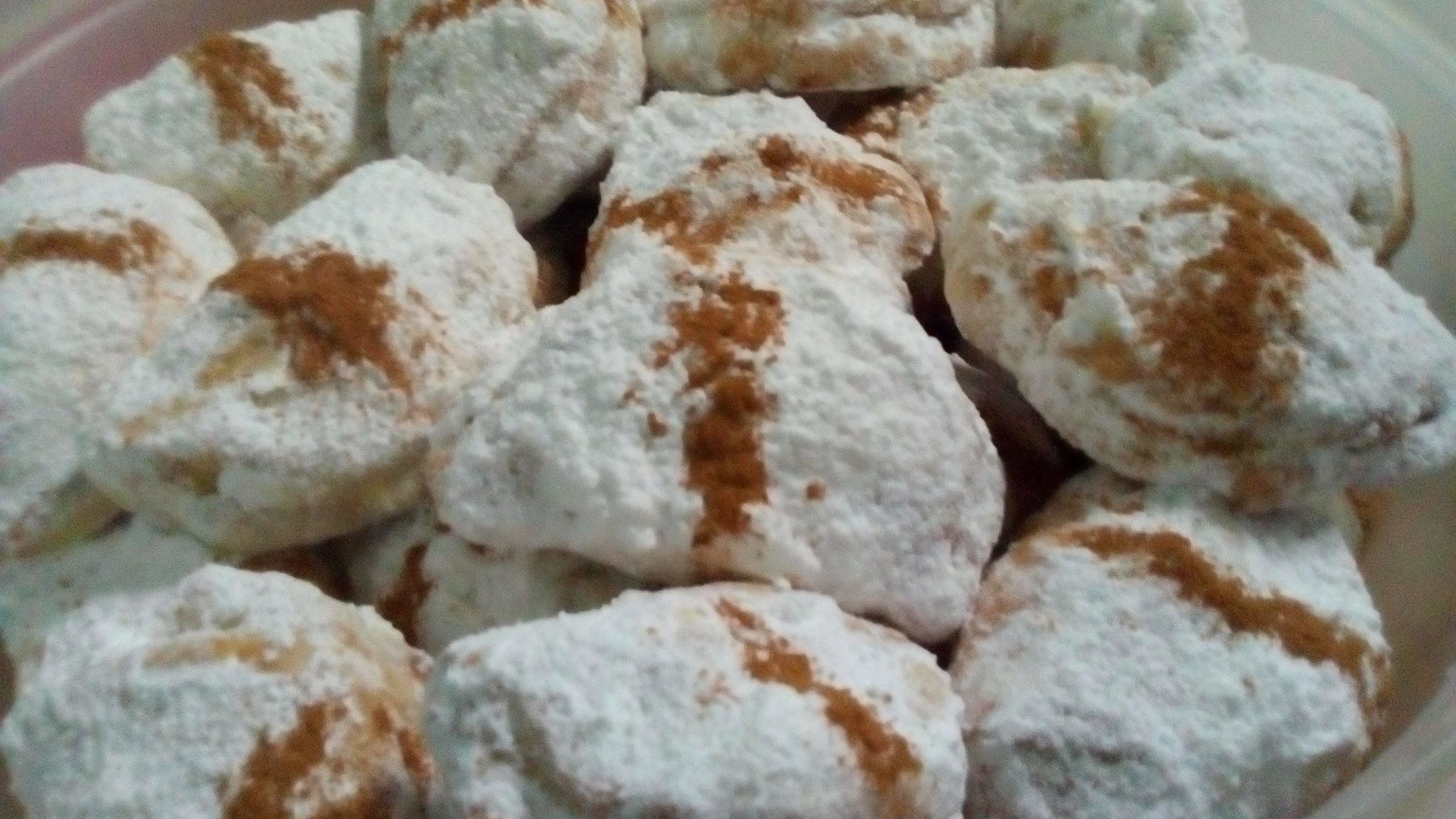 • Ψήνουμε σε 180 βαθμούς αέρα για 25 λεπτά. Αφού κρυώσουν τα περνάμε από ζάχαρη άχνη και πασπαλίζουμε με κανέλα.