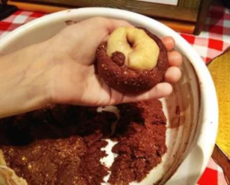 • Κόβουμε το κάθε σοκολατένιο μπαλάκι σε 3 μέρη.