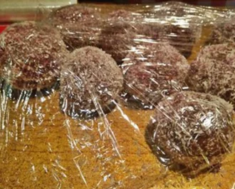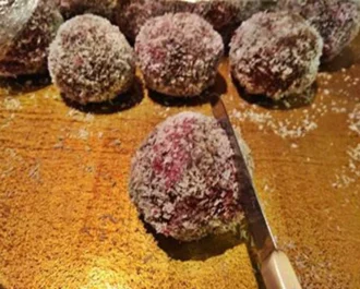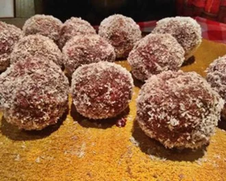 • Μόλις τελειώσουν τα σοκολατένια μπαλάκια τα βουτάμε και τα ρολάρουμε από όλες τις πλευρές μέσα στην μαρμελάδα και έπειτα τα ρολάρουμε σε ένα μπολ με ινδοκάρυδο.