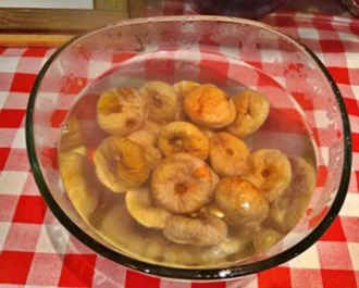Βάζουμε τα σύκα σε ένα μπολ με ζεστό νερό και τα αφήνουμε περίπου 1 ώρα να φουσκώσουν