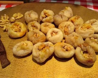 • Χωρίζουμε το μείγμα σε 10 ίσες μπαλίτσες Παίρνουμε μία μπαλίτσα, την δουλεύουμε με τα χέρια μας, κάνουμε μία μικρή βαρκούλα και μέσα προσθέτουμε από 1 σύκο γεμιστό με καρύδι, όπως φαίνεται στην φωτογραφία.