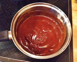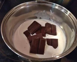 • Σε ένα κατσαρολάκι ρίχνουμε την κρέμα γάλακτος και μόλις έρθει σε σημείο βρασμού, χαμηλώνουμε την ένταση, ρίχνουμε τεμαχισμένη την σοκολάτα και ανακατεύουμε μέχρι να ομογενοποιηθούν.