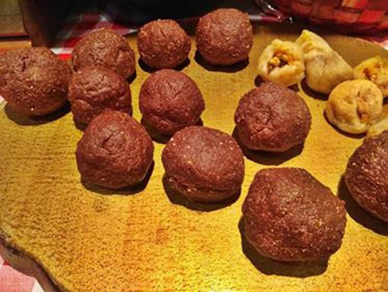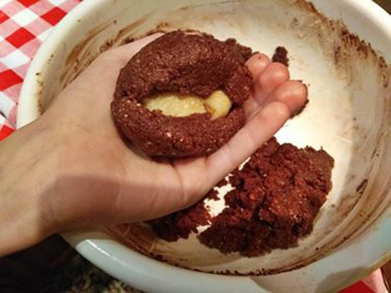 • Κόβουμε το κάθε σοκολατένιο μπαλάκι σε 3 μέρη.