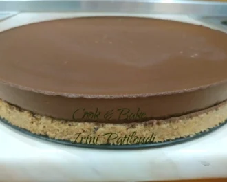 Αδειάζουμε την κρέμα σοκολάτας πάνω στη βάση της τάρτας και την στρώνουμε ομοιόμορφα. Σκεπάζουμε με μεμβράνη και αφήνουμε στο ψυγείο για 3 ώρες, μέχρι να σφίξει η κρέμα.