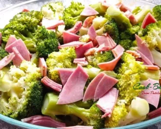 Τοποθετούμε το αλ ντεντε μπρόκολο βρασμένο για 5 λεπτά και σουρωμένο στο πυρεξ μας 26 εκ. Κόβουμε το αλλαντικό και το τυρί και ανακατεύουμε όλα μαζί.