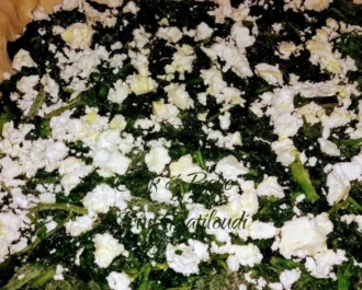 Ανοίγουμε το κάτω φύλλο όπως γράφουμε στην συνταγή της παραπομπής επάνω, προσθέτουμε το σπανάκι, αλάτι, πιπέρι, ελαιόλαδο, τυρί φέτα.