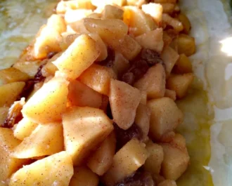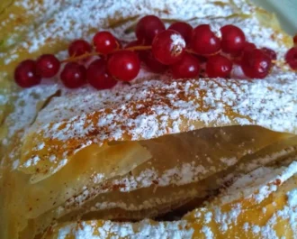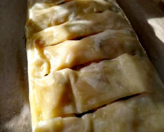 Βουτυρώνω ένα ένα τα φύλλα και απλώνω το μείγμα. Διπλωνω το στρούντελ πιάνοντας δυο δύο τα φύλλα. Δύο φύλλα και δίπλωμά. Όταν διπλώσω τα τελευταία το αναποδογυρίζω, το βουτυρώνω από πάνω και το χαράζω..