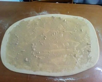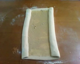 Ανοίγουμε το φύλο αλείφουμε με την γέμιση και κάνουμε ρολό και από τις δύο πλευρές. Κόβουμε στην μέση και έχουμε 2 ρολά μακρόστενα. Το καθένα το ρολάρουμε σε σαλιγκάρι.