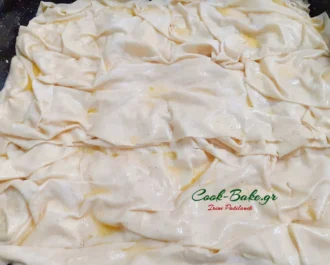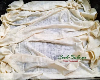 • Σκεπάζουμε με τα υπόλοιπα 3 φύλλα λαδωμένα ένα ένα και σουρωμένα. Χαράζουμε ελαφρά και πασπαλίζουμε με το αυγό, γάλα και το υπόλοιπο λάδι.