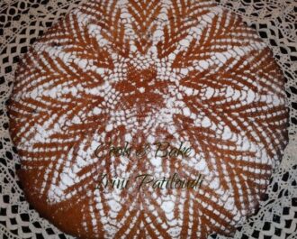 Αδειάστε το μείγμα σε ταψάκι 28 εκ η σε ατομικά μπολάκια λαδωμένα και αλευρωμένα και ψήστε στους 175 βαθμούς σε προθερμασμένο φούρνο για 1 ώρα περίπου. Μόλις κρυώσει διακοσμώ με ζάχαρη άχνη που ρίχνω επάνω σε πλεκτό πετσετάκι για να μείνει το σχέδιο.