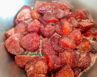 Βάζουμε μέσα και το ζουμί από τις στραγγισμένες βρασμένες φράουλες.