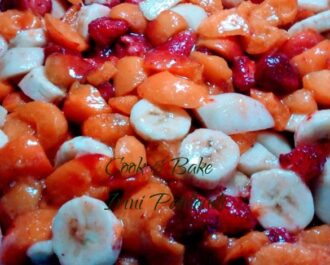 Κόβουμε και αραδιάζουμε τα φρούτα επιλογής μας σε ένα πυρέξ 28 cm.