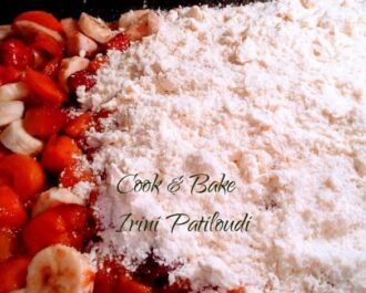 Απλώνουμε όλο το τρίμμα επάνω από τα φρούτα να σκεπαστούν καλά.
