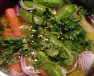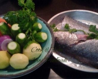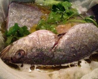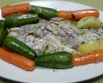 Βάζουμε σε κατσαρόλα όλα τα λαχανικά μας ολόκληρα. Κόβουμε τις πατάτες στα τέσσερα και ψιλοκόβουμε το σέλινο. Ρίχνουμε λίγο λάδι. Μέσα σε γάζα τοποθετούμε το ψάρι με λίγο σέλινο. Βάζουμε τόσο νερό όσο να φτάσει στην μέση του ψαριού, δεν το σκεπάζουμε. Βράζουμε και σε 10 - 15 λεπτά γυρίζουμε το ψάρι ώστε να βράσει και από την άλλη πλευρά.