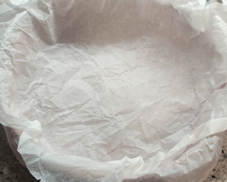 Στρώνουμε χαρτί ψησίματος αφού ρο έχουμε τσαλακώσει πριν σε μία φόρμα 22 με 24 εκ.