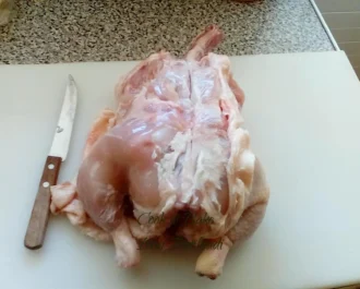 • Μετά κόβω τα μπούτια και τα ξεκοκαλίζω και ανοίγω όσο μπορώ το κρέας. Το ίδιο κάνω και με το στήθος. Πλένω καλά το κρέας και την πέτσα και τα στραγγίζω από τα νερά. Βάζω σε μια λεκάνη τα κρέατα και τους ρίχνω όλα τα μπαχαρικά συν την μουστάρδα και τα ανακατεύω με τα χέρια μου.