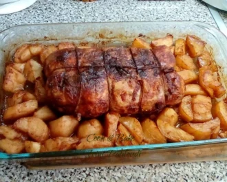 • Μετά αρχίζω να διπλώνω τα κρέατα σε ρολό μαζί με την πέτσα και δένω με σπάγκο. Τοποθετώ το ρολό στο πυρέξ και αφού κόψω πατάτες τους βάζω αλάτι, πιπέρι και πάπρικα και τις στρώνω γύρω από το ρολό.