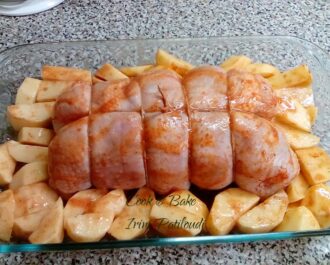 Μετά αρχίζω να διπλώνω τα κρέατα σε ρολό μαζί με την πέτσα και δένω με σπάγκο. Τοποθετώ το ρολό στο πυρέξ και αφού κόψω πατάτες τους βάζω αλάτι, πιπέρι και πάπρικα και τις στρώνω γύρω από το ρολό.