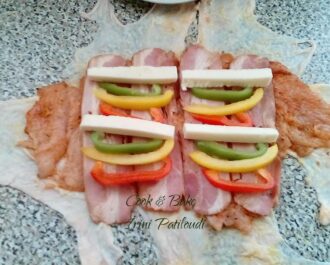 Απλώνω την πέτσα στον πάγκο και στρώνω από πάνω το μισό στήθος. Μετά βάζω τις 4 φέτες μπέικον, τυρί και πιπεριές κομμένα σε μπαστουνάκια. Μετά βάζω το κρέας από τα δύο μπούτια και ξανά μπέικον, τυρί και πιπεριές και σκεπάζω με το άλλο μισό στήθος.