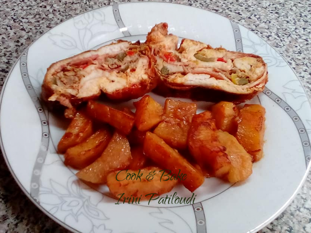 Kοτόπουλο ρολό σπιτικό, γεμιστό με μπέικον, κεφαλογραβιέρα και